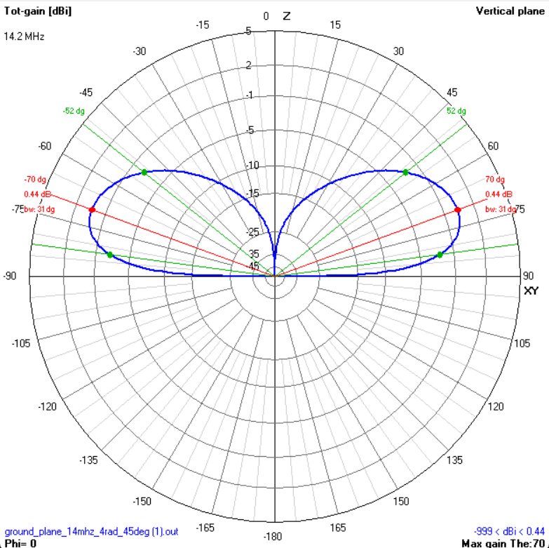 The radiation pattern is omnidirectional in azimuth with a low takeoff angle — ideal for DX on 20 metres. Check the radiation pattern plots above to see the elevation and 3D patterns from the simulation.